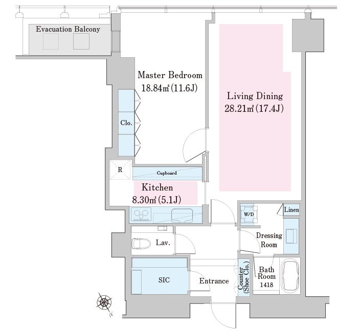 間取りは無駄のない動線設計を基本とし、居室・水回り・収納がバランスよく配置されています。また、大きな開口部を設けることで、都心部でありながらも十分な採光を確保。日中は自然光が室内を包み込み、明るく開放的な住環境を実現します。在宅ワークやプライベート時間を重視する現代のライフスタイルにもフィットする、完成度の高い住戸設計です。