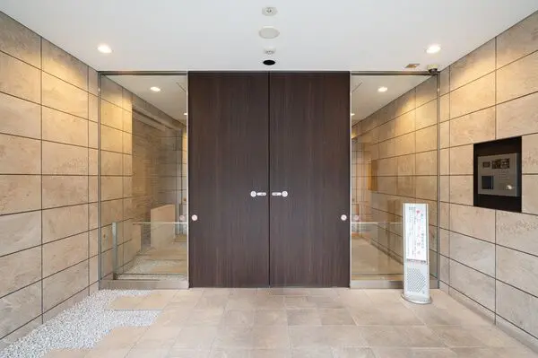 アトラス市ヶ谷の外観は、落ち着きと洗練を両立させたデザインが印象的です。ブラウンとブラックを基調としたタイル貼りのファサードが重厚感を演出し、植栽を施したエントランスが街並みに柔らかな印象を与えています。エントランスアプローチには歩車分離設計を採用し、車と歩行者の導線を分離することで安全性を高めています。エントランスホール内部は間接照明を活かした上質な空間で、ホテルラウンジのような静謐さを感じさせる仕上がり。セキュリティ面でも、オートロックや防犯カメラを複数箇所に設置し、居住者の安心を確保しています。また、内廊下構造によって外部からの視線を遮りつつ、空調環境を整えることで、快適性と防犯性の両立を実現。アトラスシリーズの中でも特に「品格と安心」を重視した設計であり、都心の暮らしにふさわしい静けさと高級感を感じさせる外観美です。
