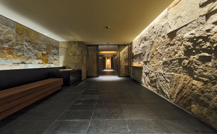 - 木質と石材を組み合わせた共用空間