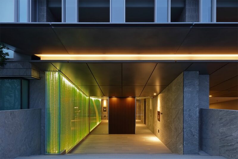 アプローチ部分には天然石と植栽が組み合わされ、外から内部へと導かれる動線は、まるで美術館のような静けさ。内廊下設計を採用することで、外部の音や気配を遮断し、居住者だけの落ち着いた空気が流れています。