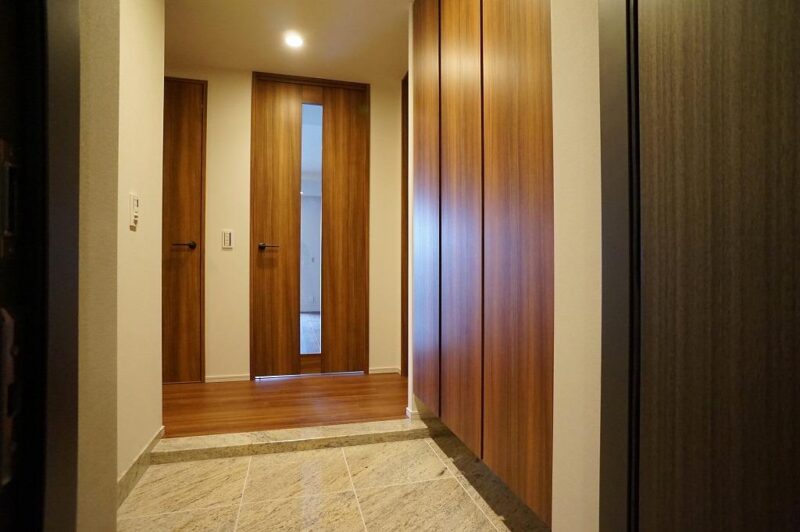 内部に足を踏み入れると、2層吹き抜けのラウンジが住まいの品格を象徴するように広がり、柔らかな照明と落ち着きのあるインテリアが上質な時間を演出します。居住者同士のプライバシーに配慮した内廊下設計は、高級ホテルのような静けさと安心感を生み出し、外の喧騒とは一線を画す上質な生活空間を創出しています。