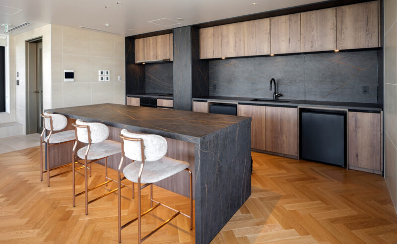 建物外観は、白と黒のコントラストが際立つシンプルで洗練されたデザイン。エントランスは二層吹き抜けの開放感ある設計で、石材や木調パネルを使った温かみのある空間が来訪者を迎えます。共用部にはオートロック、防犯カメラ、宅配ボックスなどを完備しており、セキュリティ面にも配慮が行き届いています。高級感のある内廊下設計が採用されており、プライバシー性の高い居住空間が実現されています。